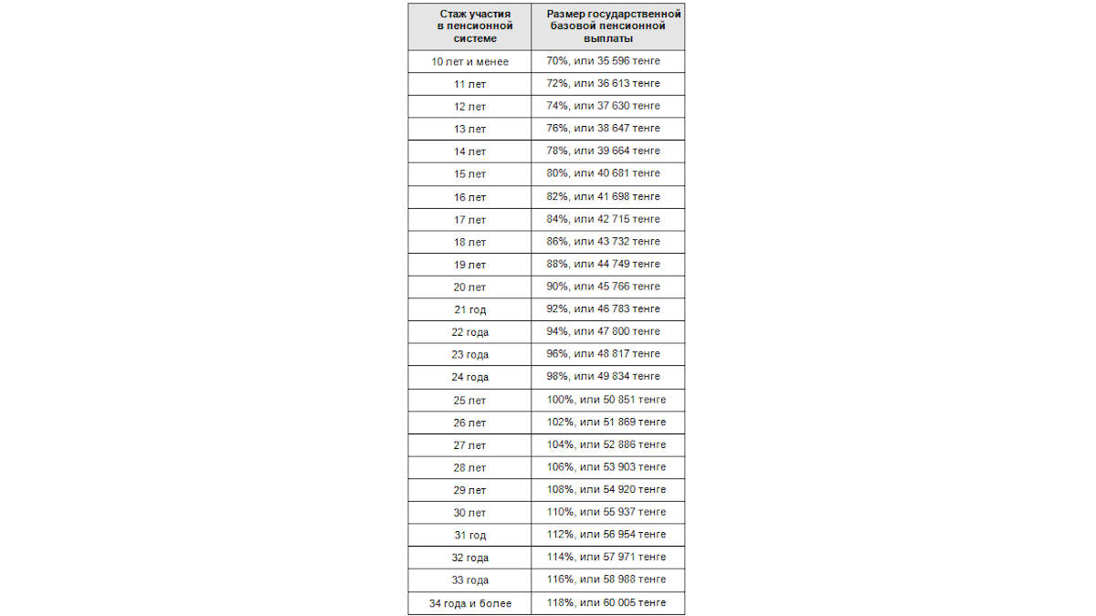 Для сравнения: в 2025 году базовая пенсионная выплата предоставлялась также при наличии 10 и менее лет стажа участия в пенсионной системе либо его отсутствии в размере 70 процентов от величины прожиточного минимума. Базовая пенсионная выплата также увеличивалась на два процента за каждый дополнительный полный год стажа. Но максимальный ее размер ограничивался 110 процентами от величины прожиточного минимума (ПМ в 2025 году — 46 228 тенге).