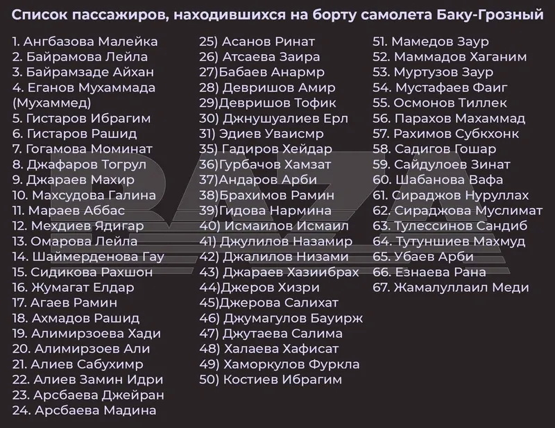 Российский Telegram-канал BAZA опубликовал список пассажиров, летевших рейсом Баку – Грозный. По предварительной информации азербайджанской стороны, на борту находились 62 пассажира и 5 членов экипажа, сообщает Zakon.kz.