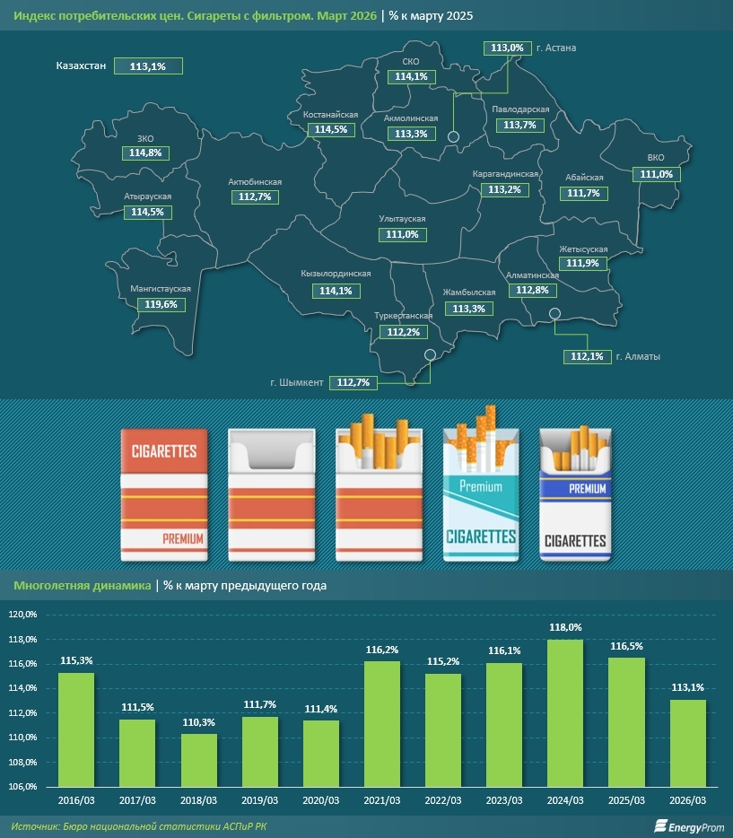 Несмотря на преобладание местной продукции, стоимость табачных изделий для конечного потребителя продолжает стабильно расти, хотя темпы инфляции в секторе несколько замедлились, передает YK-news.kz со ссылкой на Energyprom.kz.