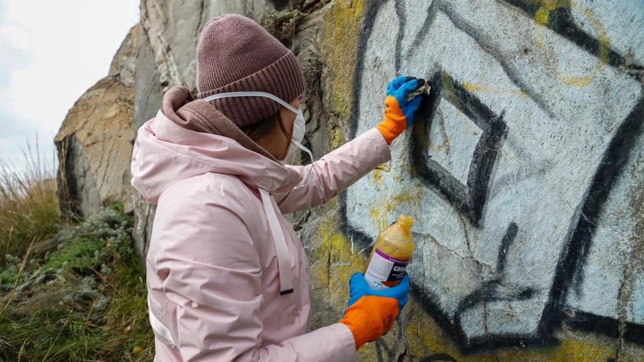 «Чтобы было интересно, решили разделиться на несколько команд — каждой выделили свой участок скалы, предоставили инвентарь и чистящие средства. Команда, которая быстрее и качественнее справится с задачей, получает призы», — рассказал Вячеслав Орлов.
