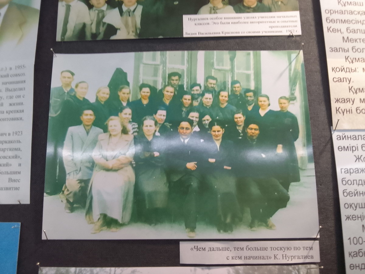 — На данном стенде мы можем ознакомиться с началом педагогической деятельности Кумаша Нургалиева, — продолжила рассказ Альфия Токтасынова. — Она началась в октябре 1946 года, когда он впервые перешагнул порог Сорвенской семилетней школы. Тогда здание школы было маленьким, поэтому в 1948 году он организовал строительство нового здания. Ниже представлены фотографии одних из первых учеников Кумаша Нургалиевича и директора школы соседнего села.