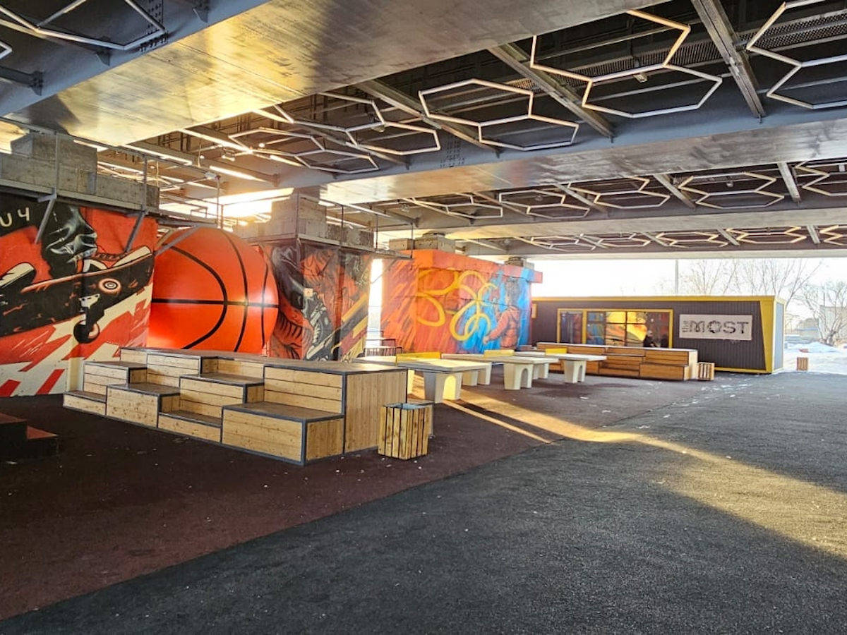 Подмостовое пространство, напомним, включает баскетбольную площадку, восьмиугольный ринг для ММА, спортивную площадку, теннисные столы, турники, велопарковки и малые архитектурные формы.