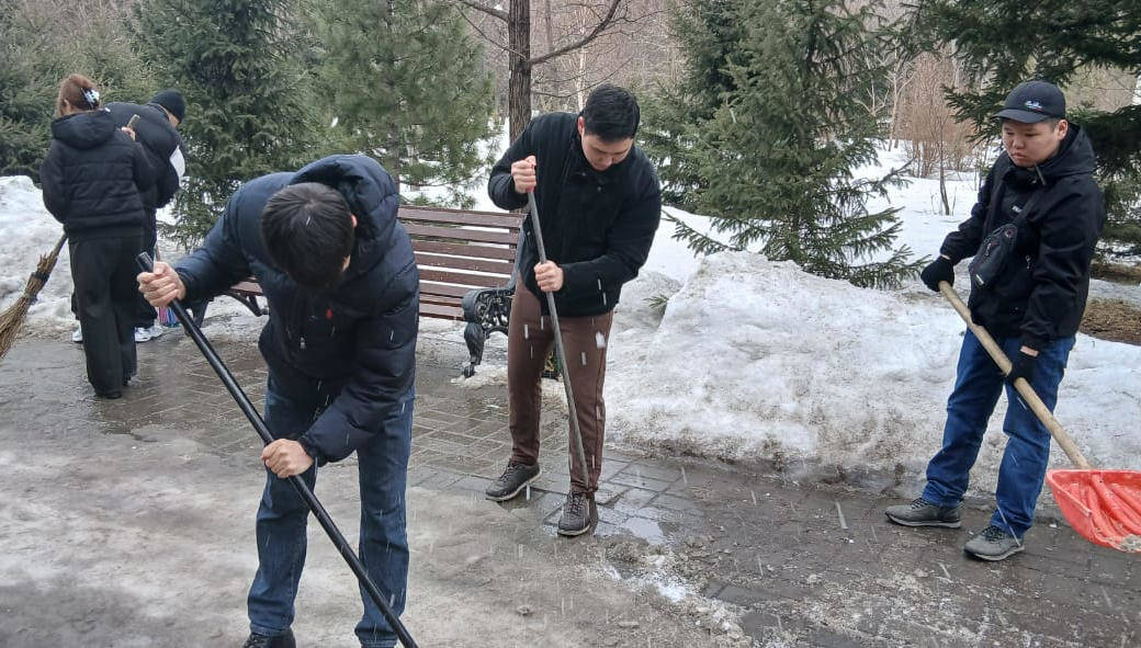 Акция стартовала в 10.00. Фронт работ включал уборку мусора и расчистку дорожек парка ото льда и снега. Кроме того, для памятника великому акыну, украшающего центральную площадку зоны отдыха, настало время водных процедур – статую предстояло вымыть и обновить гранитную плитку на пьедестале.