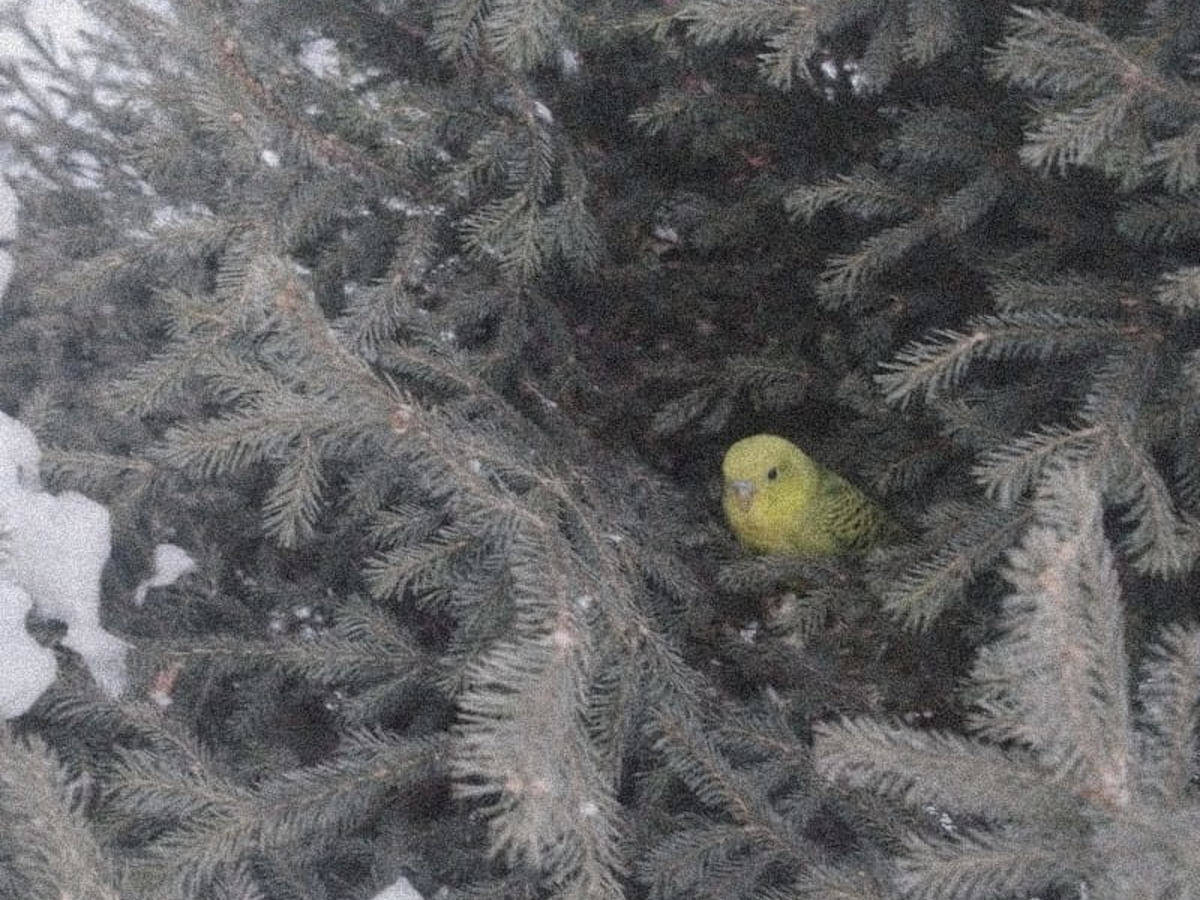Горожане поделились, что первой увидела за окном попугая их дочь. Взрослые сначала не поверили, а через несколько дней среди ветвей елки сами заметили пернатого.