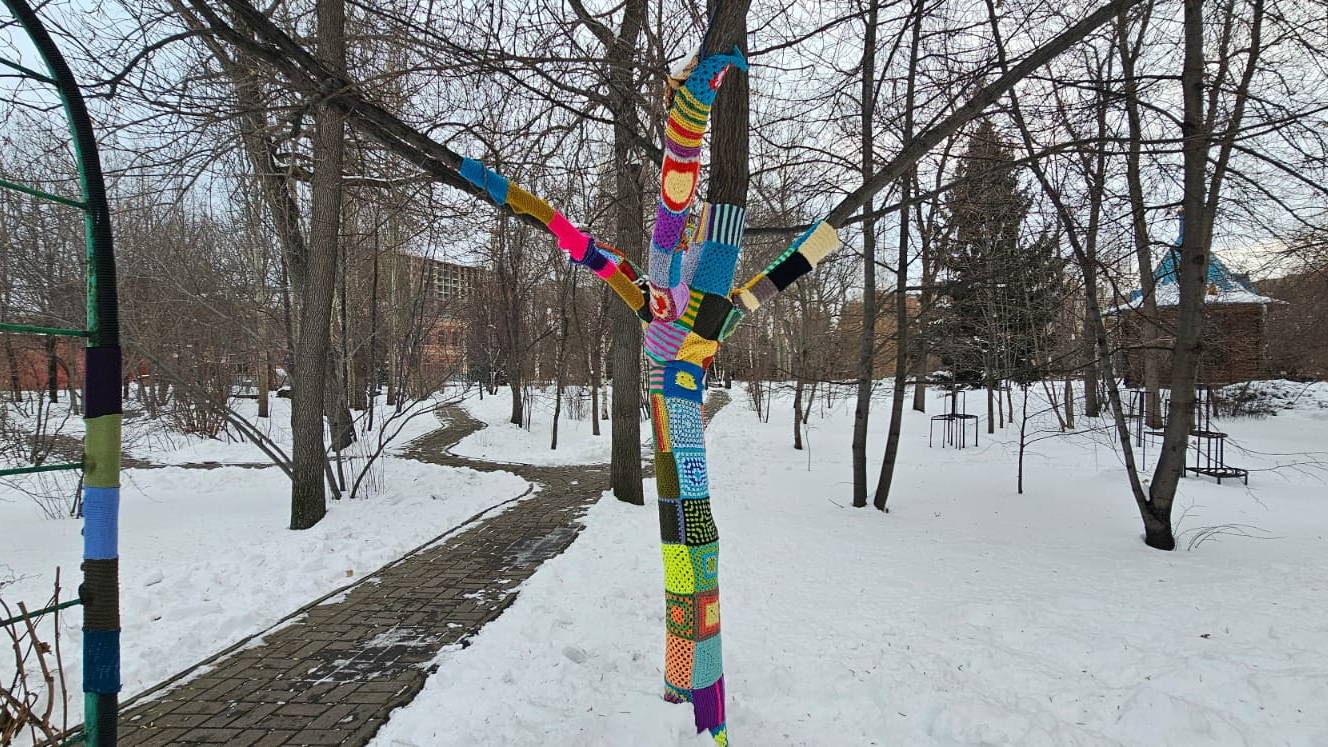 — По инициативе нашей сотрудницы Ирины Баянжановой в городе проходит акция «Мы обвязываем город», — сообщили в Центре креативной индустрии. — Она предложила украсить одно из деревьев в парке яркими вязаными квадратами.