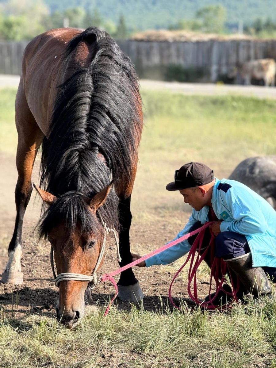 — Когда коню первый раз недоуздок надеваем, сразу надо учить спокойно, — рассказывает Жасұлан. — Манеры остаются с первого раза и до конца его жизни. Нельзя бить, силой требовать чего-то, психику ломать. Если сломать, он будет злиться и мстить. Лошадь — это спокойное животное. Но гордое. Они могут сильно привязываться. Бывает, когда другой всадник садится, он его не слушается.
