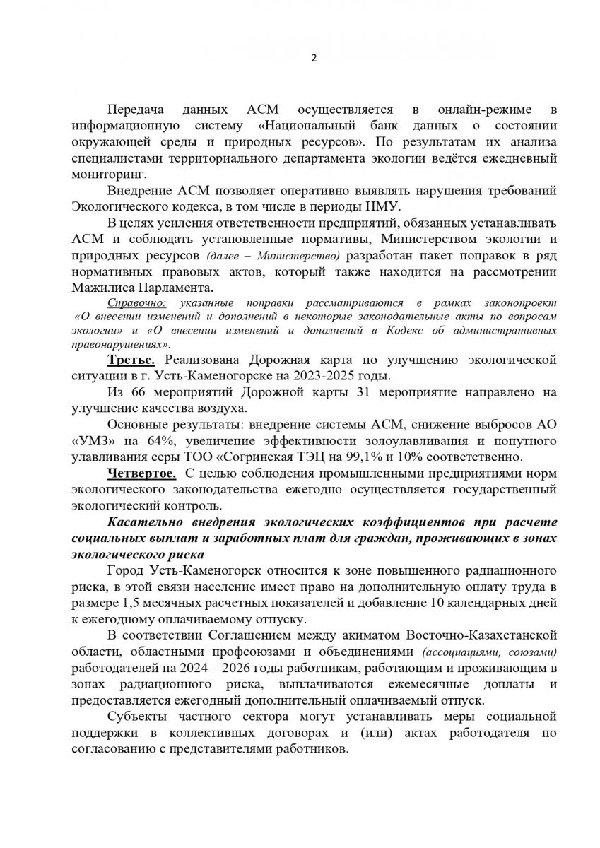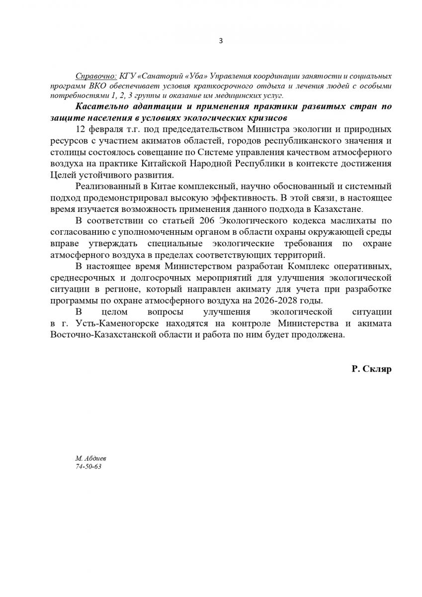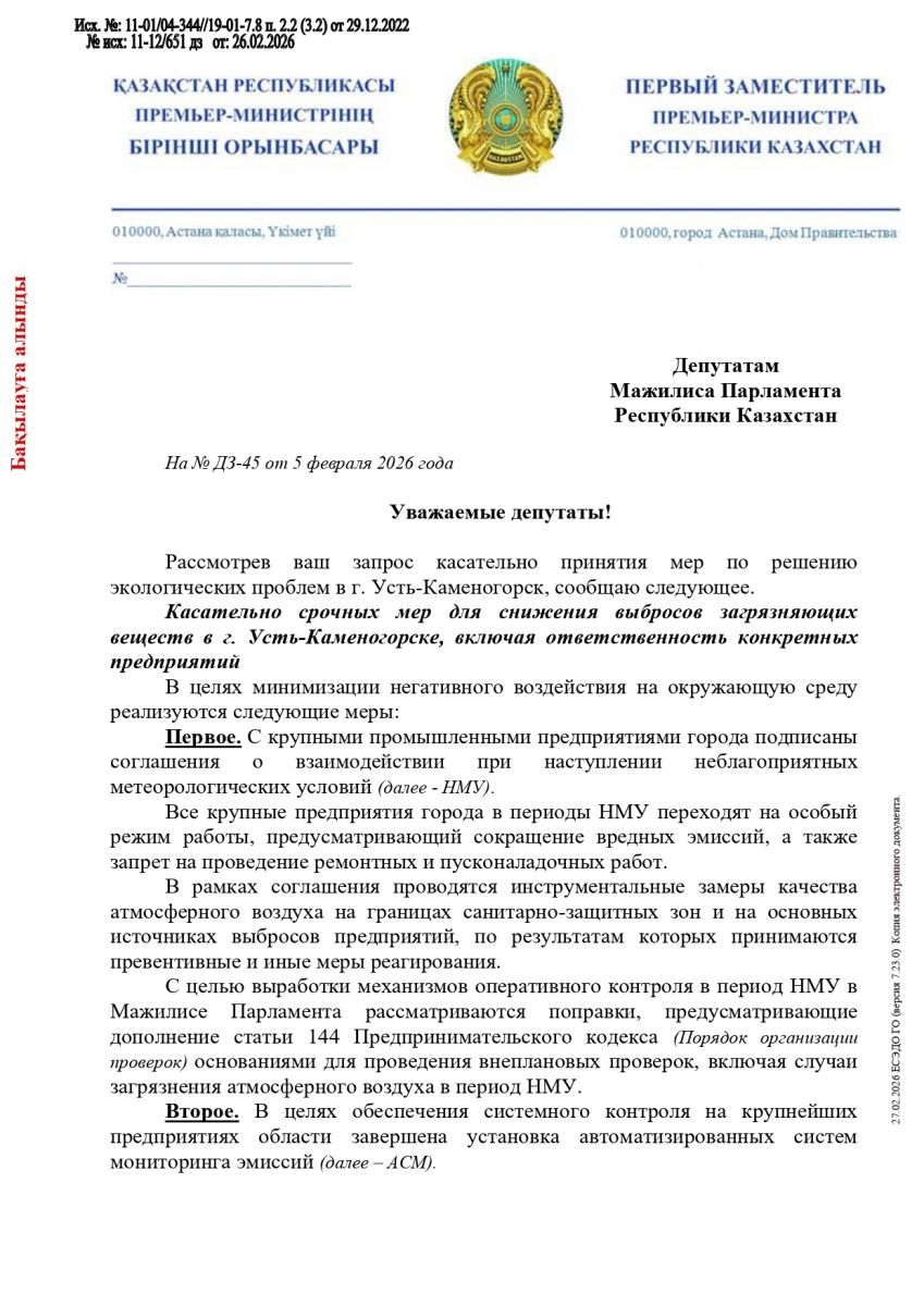 Какие срочные меры будут приняты Правительством для реального, а не формального снижения выбросов загрязняющих веществ в Усть-Каменогорске, включая ответственность конкретных предприятий?