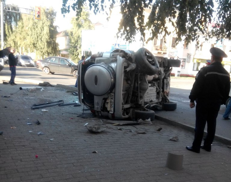 В центре Усть-Каменогорска внедорожник перевернулся и снес светофор